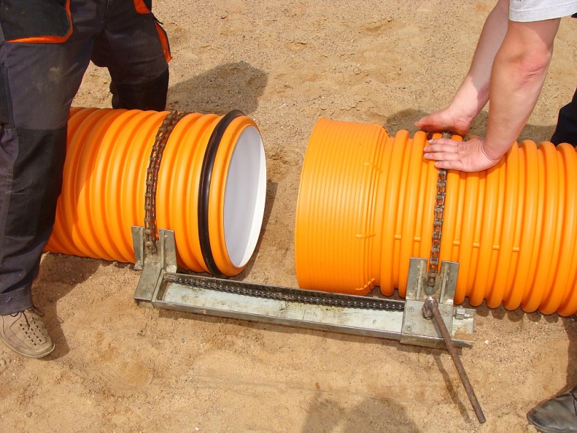 Перед соединением сегментов трубы уплотнительное кольцо устанавливают в последний паз перед ребром. Конец трубы с раструбом перед соединением необходимо очистить от грязи. Укладка труб проводится в направлении, противоположном движению сточных вод.